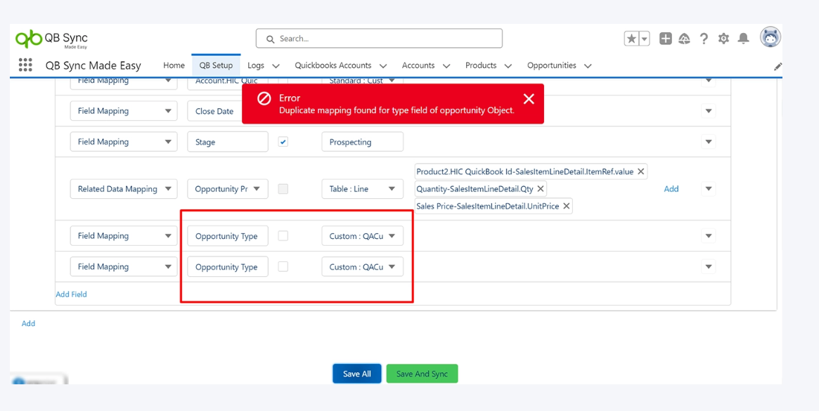 Multiple QB fields are getting mapped with a single Salesforce field. Mappings are getting saved.