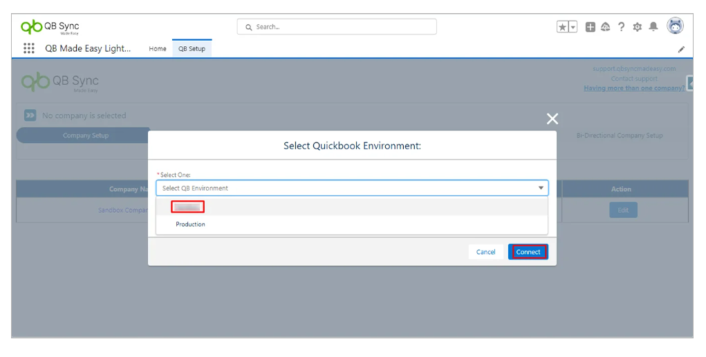 Click the connect button after selecting the Sandbox or Production QuickBooks Environment. Here we’re selecting Sandbox.