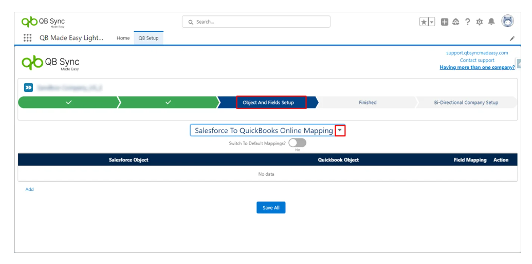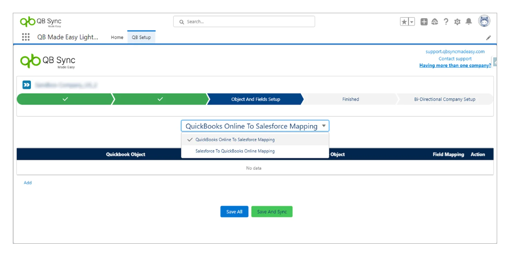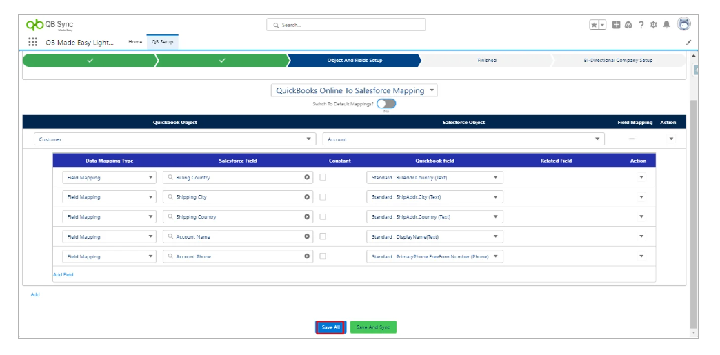 In the same way, you can save mapping for Salesforce to QuickBooks, you need to go to the object and field setup page and do the mapping the same as above.