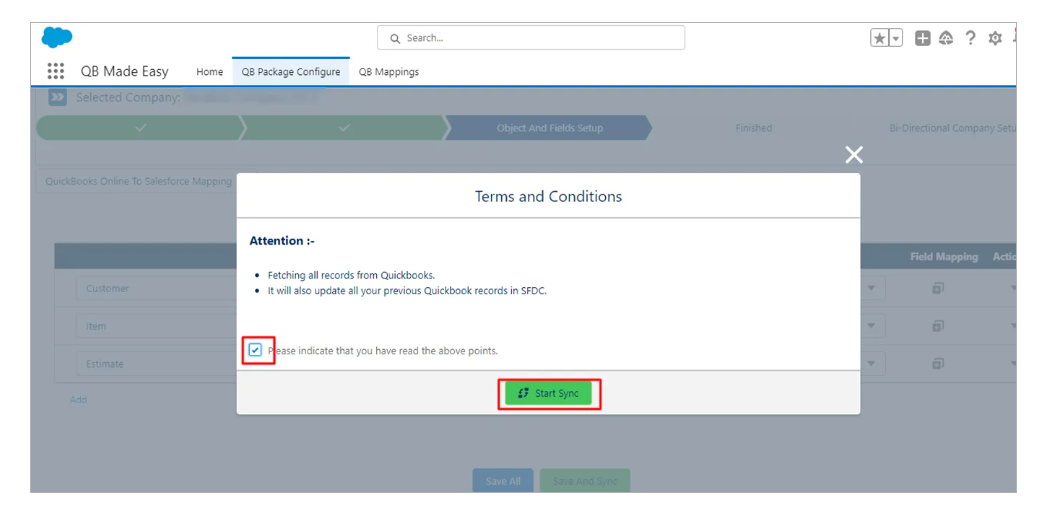 Once you’ve clicked on save, and sync a Modal will pop up, tick on the checkbox and click on Start sync.