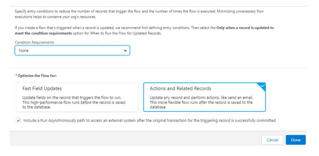Also, click on the checkbox to run the flow asynchronously and then click on done.