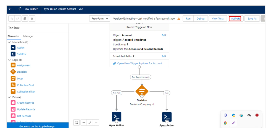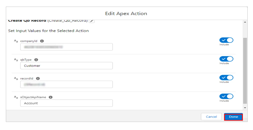 Now click on drag and drop Action. Add apex action to the flow named “Create Qb Record” Fill required fields in Flow then you have to create an Account