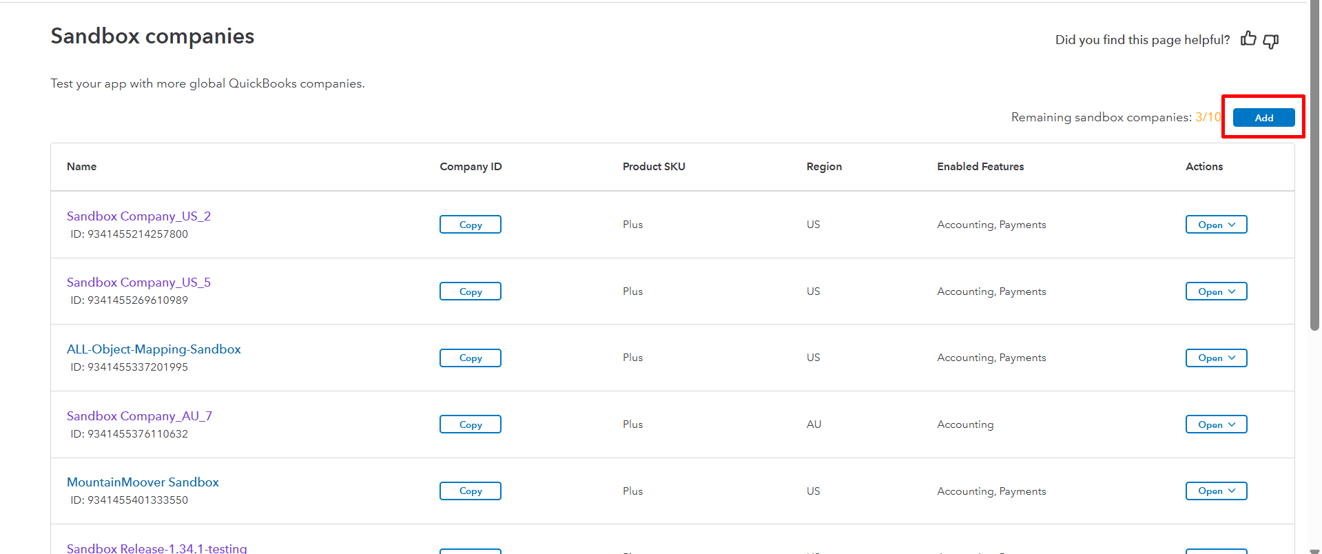 Click on the Add button to create a new sandbox company.